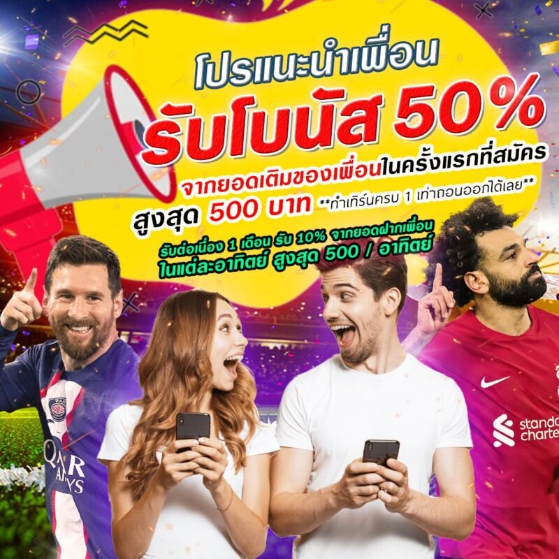 เพื่อนสมัครเท่าไหร่คุณได้ 50% จากยอดสมัคร รับทันทีเมื่อเพื่อนมียอดเล่นครบเท่ายอดฝาก